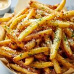 - Toss Fries with Topping: Once the fries are cooked and crispy, transfer them to a large bowl. Pour the garlic butter over the fries, then sprinkle with grated Parmesan cheese and chopped fresh parsley. Toss gently to coat evenly.