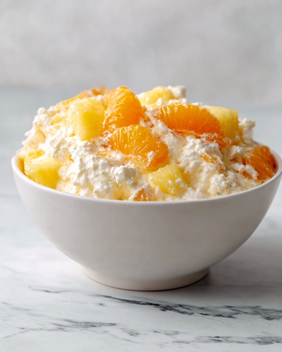 This classic Ambrosia Salad is a refreshing and sweet dessert featuring mandarin oranges, pineapple tidbits, miniature marshmallows, shredded coconut, and creamy sour cream. Perfectly chilled, it blends fruity and creamy textures for a delightful treat that’s easy to prepare and serves well as a side dish or dessert.