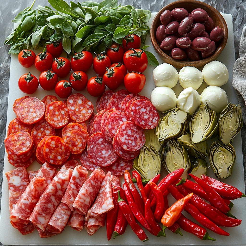 - Kalamata olives: Dark and briny, their depth of flavor is a must for authentic antipasto character.