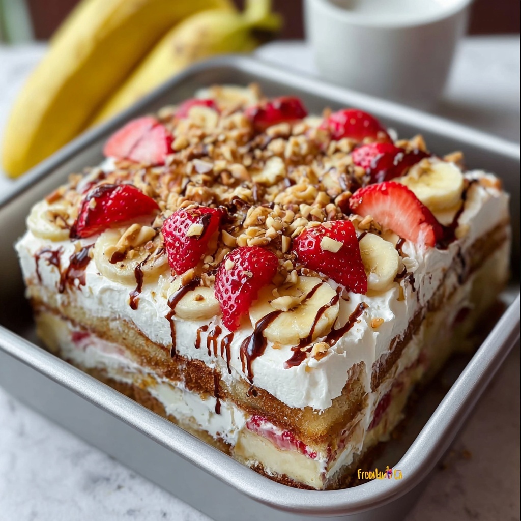 This Banana Split Dump Cake is a quick and easy dessert that layers ripe bananas, crushed pineapple, and fresh strawberries under a buttery cake mix topping. Baked to a golden brown and served with whipped cream, fresh fruits, and crunchy nuts, this dessert perfectly mimics the classic banana split flavors in a moist, comforting cake form.