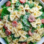 - Cook Pasta: Cook the bow tie pasta according to the package instructions until al dente. Once cooked, drain the pasta and rinse it with cold water to cool down and stop the cooking process.