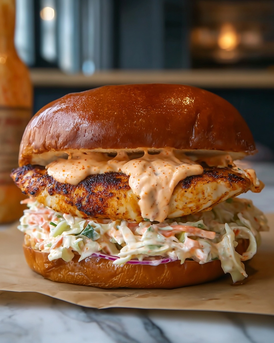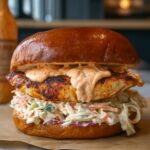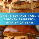 This Buffalo Ranch Coleslaw Topped Chicken Sandwich features crispy fried chicken breasts marinated in buttermilk and coated in a seasoned flour mixture, topped with a tangy and spicy buffalo ranch coleslaw. The sandwich is perfectly balanced with creamy, spicy, and crunchy elements, making it an irresistible option for a flavorful lunch or dinner.