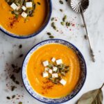 A warming and comforting Butternut Squash and Pumpkin Soup featuring a blend of roasted butternut squash, creamy pumpkin purée, and fragrant spices, finished with coconut milk for a smooth, vegan, and gluten-free autumn-inspired dish.