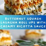 Delicious Butternut Squash Lasagna Roll Ups with creamy ricotta and a rich béchamel sauce, layered with Parmesan, mozzarella, and aromatic sage. This comforting vegetarian dish combines tender lasagna noodles rolled with a flavorful squash filling, baked to perfection and garnished with crispy fried sage leaves for added texture and aroma.