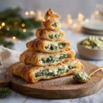 Serving your Christmas Tree Spinach Dip Breadsticks Recipe on a festive serving board surrounded by sprigs of fresh rosemary or pine adds to the holiday spirit. You can also place a small bowl of marinara sauce or ranch dressing in the center as “tree stump dip,” giving your presentation a charming, interactive twist that guests will love.