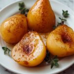 - Bake the Pears: Cover the baking dish with aluminum foil to retain moisture and bake for 20 minutes. Then remove the foil and continue baking for an additional 10–15 minutes, until the pears are tender and caramelized.