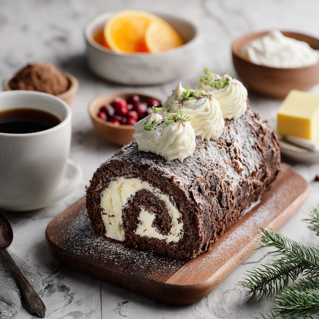 Whip the heavy cream with powdered sugar and vanilla until stiff peaks form. If you like, fold in mascarpone or extra cocoa powder to enrich the filling. Unroll the cooled cake, spread the cream filling evenly, then re-roll it without the towel. Next, beat the butter with powdered sugar, cocoa, milk, salt, and optional espresso or rum to create a fluffy frosting. Spread evenly over the cake and use a fork or spatula to create a chestnut bark texture that makes your Yule Log look delightfully rustic.