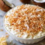 - Assemble dip: Spread the creamy dip into a serving bowl and evenly sprinkle the toasted coconut over the top, adding texture and flavor.