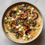 This Creamy Mushroom & Pearl Couscous Soup is a comforting and hearty dish featuring tender mushrooms and chewy pearl couscous in a rich, creamy broth. Perfect for a warming meal, this vegetarian soup balances earthy mushrooms with a hint of fresh lemon and herbs for a deliciously satisfying bowl.