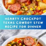A hearty and flavorful Crockpot Texas Cowboy Stew combining ground beef, kielbasa sausage, a variety of vegetables, and spices. Slow-cooked to perfection for tender, comforting stew ideal for family meals.