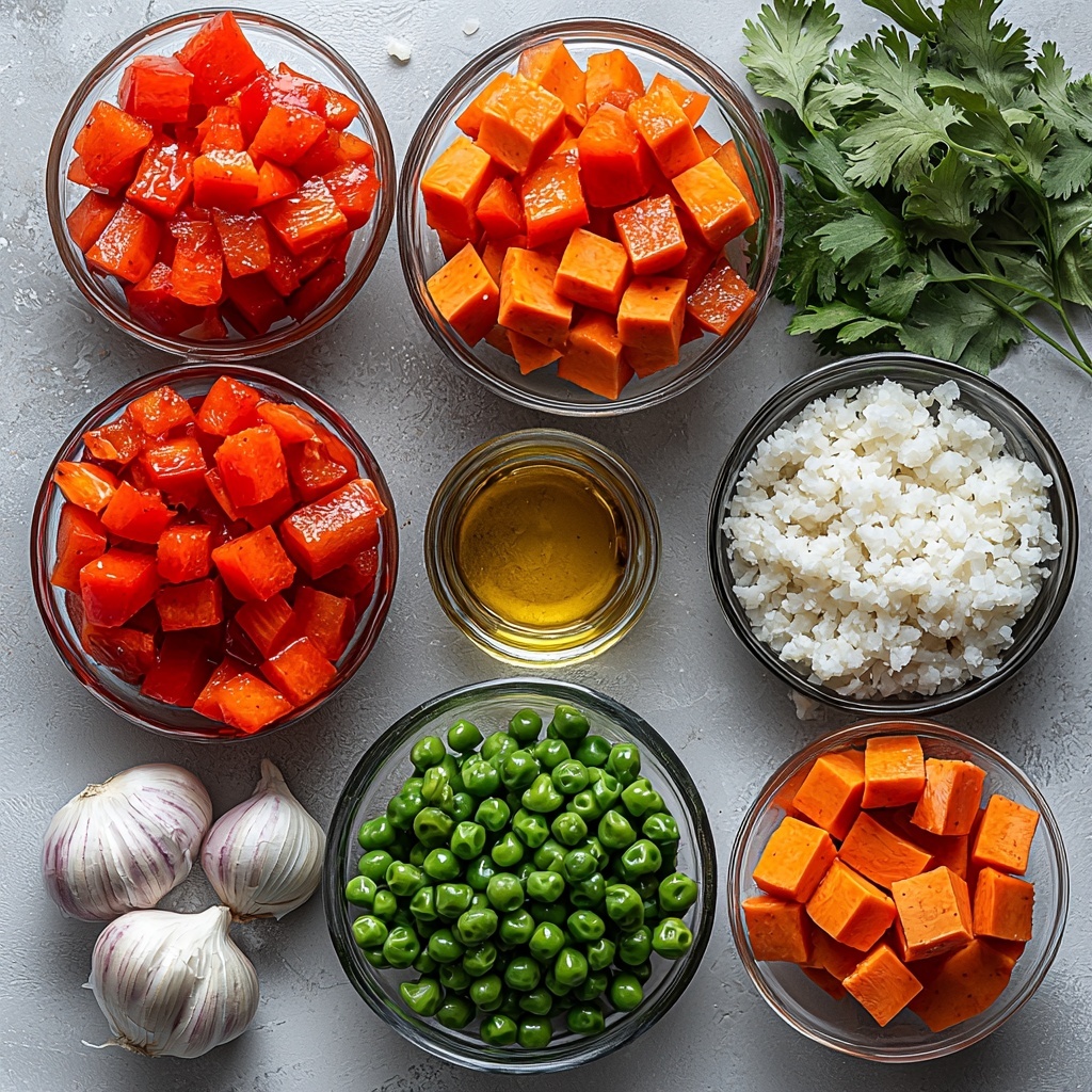 Start by letting your frozen cauliflower rice and green peas thaw at room temperature for about 10 minutes. This simple step helps them cook evenly and allows flavors to meld better in the pan.