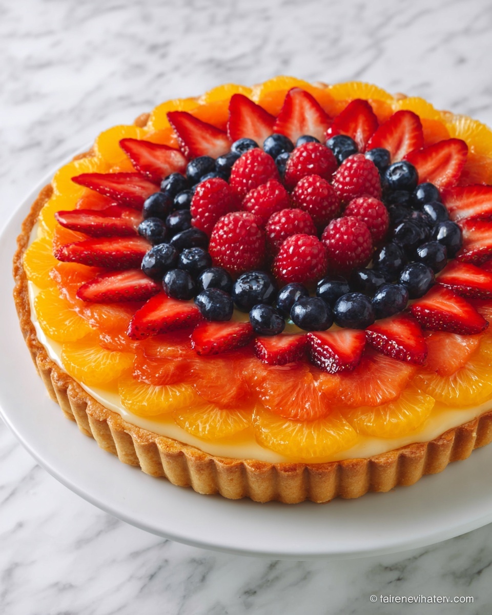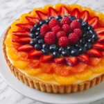 This Fresh Fruit Tart recipe features a crisp, sweet tart crust filled with smooth pastry cream and topped with an assortment of vibrant fresh fruits. The tart is finished with a glossy apricot glaze that adds a beautiful shine and a hint of sweetness, making it a perfect elegant dessert for any occasion.