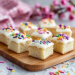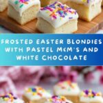 These Frosted Easter Blondies are a festive and colorful treat perfect for spring celebrations. Featuring chewy blondie bars filled with pastel M&M’s and white chocolate chips, then topped with a creamy vanilla frosting and decorated with sprinkles, they combine buttery sweetness with a fun holiday twist.