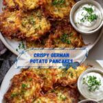 Serve your German Potato Pancakes (Kartoffelpuffer) Recipe piping hot, paired with either the classic apple sauce or the herbed sour cream. Both toppings provide a delightful balance – the apple sauce sweetens and lightens, while the sour cream adds richness and a lovely herbal zing. Dig in immediately to enjoy that perfect mix of textures and flavors!