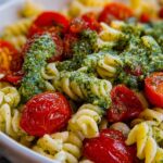 - Toss pasta with pesto: In a large bowl, mix the cooled pasta with basil pesto until each piece is evenly coated.