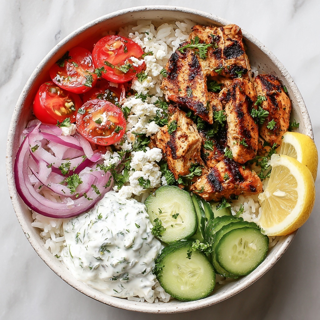- Layer the Flavor: Arrange the sliced grilled chicken on top, then add spoonfuls of creamy hummus and tangy tzatziki sauce. Crumble the feta cheese evenly over the bowl.
