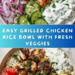 A vibrant and healthy Homemade Cava Bowl featuring grilled lemon chicken, fresh vegetables, creamy hummus and tzatziki, and a base of warm white rice, perfect for a quick and flavorful meal.