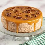 Once the cheesecake is done, allow it to cool completely before releasing from the pan. Drizzle the salted caramel sauce over the top and sprinkle with chopped pecans for a beautiful, crunchy finish.