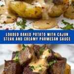 A hearty and delicious Loaded Baked Potato with Steak Bites recipe featuring tender steak pieces seasoned with cajun spices, creamy parmesan sauce, and perfectly baked russet potatoes with crispy, salted skins. This comforting dish is perfect for a satisfying dinner that combines savory flavors and creamy textures.