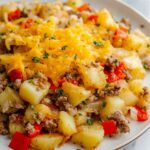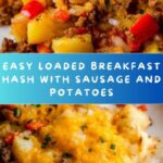 This Loaded Breakfast Hash recipe combines crispy potatoes, savory sausage or bacon, colorful bell peppers, and melty cheddar cheese for a hearty and satisfying morning meal. Topped with perfectly cooked eggs and fresh green onions or parsley, this skillet dish is perfect for a comforting breakfast or brunch that’s full of flavor and texture.