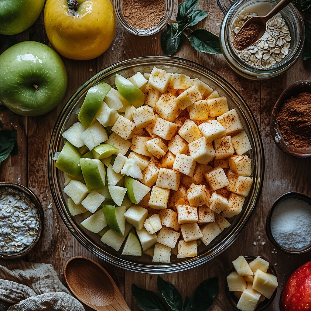- Prepare the Apple Mixture: In a large bowl, toss the sliced apples with lemon juice to prevent browning, then add brown sugar, ground cinnamon, ground nutmeg, and cornstarch. Mix thoroughly to coat the apples evenly. Spread this mixture evenly into the prepared baking dish.