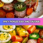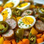 This vibrant pickled eggs, sausages, jalapeƱos, and carrots recipe combines smoky sausages, spicy jalapeƱos, crunchy carrots, and protein-rich hard-boiled eggs in a tangy, sweet, and slightly spicy vinegar brine. Perfect for a flavorful snack or appetizer, these pickled treats develop complex flavors after marinating in the refrigerator for at least 24 hours.