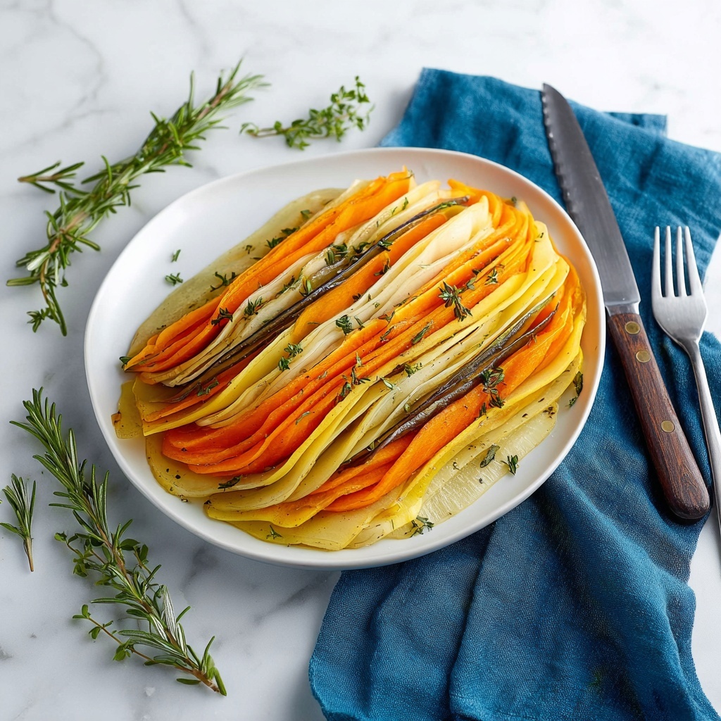After peeling, use a mandoline slicer to cut your carrots, golden beets, turnips, and sweet potato into thin, uniform slices about 1/8 inch thick. Keeping each vegetable in separate piles helps when arranging them beautifully later and ensures even cooking.