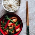 7. Serve: Plate the shrimp and vegetables over the cooked rice immediately. Season with additional salt and pepper if desired.