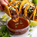 This Slow Cooker Birria Tacos Recipe freezes very well. Portion out the shredded beef and sauce into freezer-safe containers or bags and freeze for up to 3 months. Thaw overnight in the fridge and reheat gently when ready.