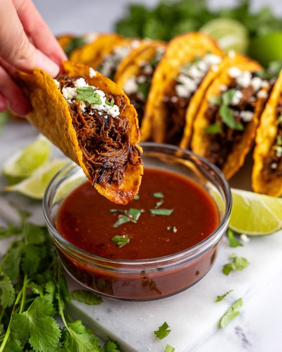Serve the reserved strained sauce on the side for dipping—this extra burst of flavor will elevate every crispy bite and take your Slow Cooker Birria Tacos Recipe to indulgent new heights.