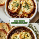 A hearty and comforting Slow Cooker French Onion Soup made with caramelized onions, rich beef and chicken broth, and topped with toasted baguette slices and melted Gruyère cheese. This recipe combines slow-cooking techniques with oven broiling to create a deeply flavorful and classic French dish.