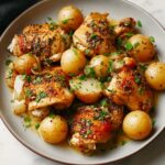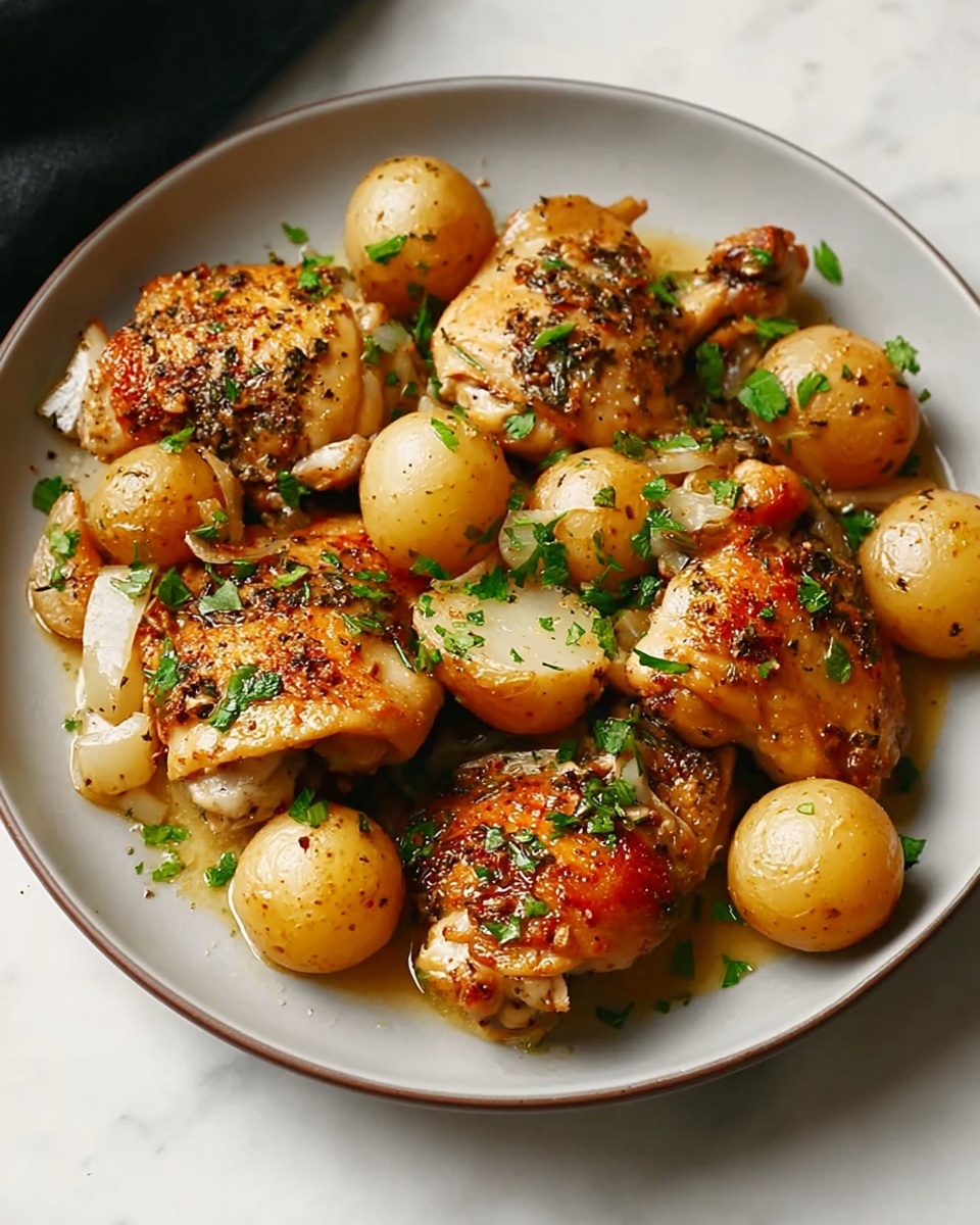 - Serve and garnish: Once cooked, serve the chicken and potatoes hot, garnished with freshly chopped parsley and, if desired, an extra sprinkle of Parmesan cheese for added flavor and presentation.