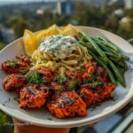 Now comes the best part: plating your masterpiece. Lay down a generous bed of creamy Alfredo pasta, crown it with the smoky grilled chicken, and add a scoop of that dreamy lemon feta whip on the side. Nestle the charred green beans right alongside, then finish by sprinkling chopped parsley and tucking in some lemon wedges for a zesty pop. The colors, textures, and flavors come together to create a dish that is as stunning as it is delicious.