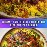 This Smothered Chicken and Rice recipe is a comforting one-pot Southern American classic featuring crispy, seasoned chicken thighs nestled over creamy, herb-infused rice. The rich combination of sautéed vegetables, tender chicken, and a luscious sauce made from chicken broth and heavy cream makes it a satisfying and flavorful main course perfect for weeknight dinners or meal prep.
