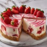 Finally, dust the cake lightly with confectioners’ sugar and serve alongside a fresh strawberry sauce and sliced strawberries. The fruity brightness contrasts beautifully with the creamy, airy cheesecake, making every bite a delight.