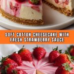 This soft cotton cheesecake with strawberry sauce is a light and fluffy Japanese-style cheesecake that combines creamy cream cheese with a delicate sponge texture. Baked in a water bath for perfect moisture, this dessert is topped with a dusting of confectioners’ sugar and fresh strawberry sauce, making it an elegant and delicious treat.