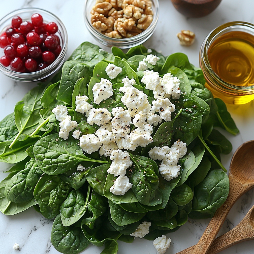 A fresh and nutritious Spinach Salad featuring tender baby spinach, creamy goat cheese, crunchy toasted walnuts, and sweet craisins, all tossed in a tangy homemade balsamic vinaigrette. This quick and easy recipe is perfect for a light lunch or a healthy side dish.