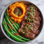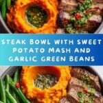 A flavorful Steak Bowl featuring perfectly seared sirloin or ribeye steak served alongside creamy sweet potato mash and garlicky sautéed green beans, all topped with a vibrant chimichurri sauce. This balanced meal combines hearty protein with nutritious vegetables and zesty herbs for a satisfying, wholesome dish.