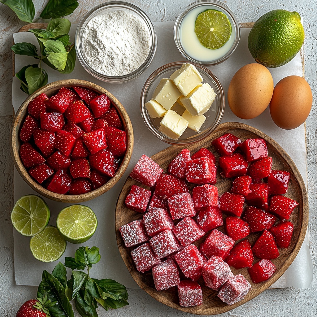 These Strawberry-Lime-Coconut Lamingtons are a delightful twist on the classic Australian treat, featuring a moist vanilla cake infused with fresh strawberries and zesty lime, coated in a luscious coconut glaze and rolled in unsweetened coconut flakes. Perfect for summer gatherings or an elegant dessert, these lamingtons balance fresh fruity flavors with a creamy, tropical coating.