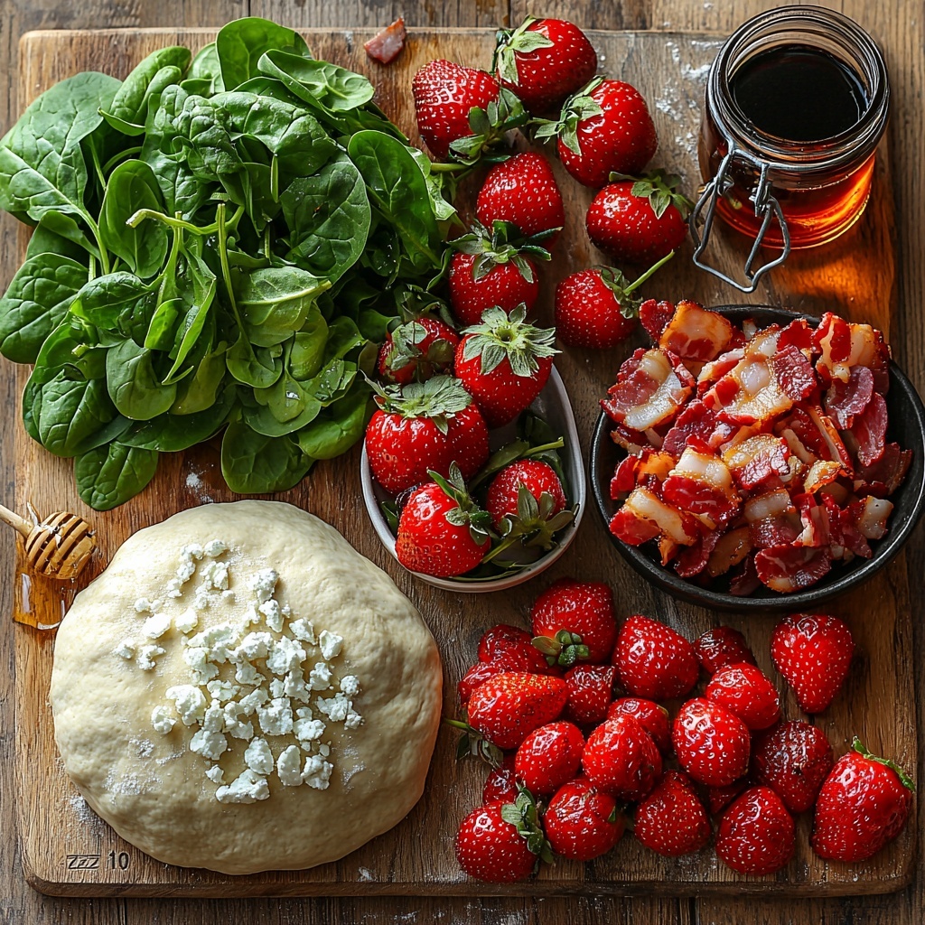 Once the crust has a slight bake, carefully layer on fresh spinach and sliced strawberries. Their combination brings that essential summer vibe to the pizza. Next, sprinkle cooked, crumbled bacon generously over the top for crunch and savory balance. Add crumbled feta cheese in small clusters, so you get melty pockets of flavor in every bite.