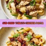 A flavorful Sun-dried Tomato Chicken Pasta recipe combining tender seared chicken strips with sun-dried tomatoes, garlic, and fresh basil, all tossed with al dente pasta and freshly grated Parmesan cheese. This dish blends savory and tangy flavors for a quick and satisfying weeknight dinner.