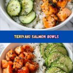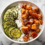 - Assemble the Dish: Place a scoop of cooked rice on each plate. Top the rice with the seared teriyaki salmon bites and a generous serving of the avocado cucumber salad. Drizzle the spicy sriracha mayo over the top and garnish with sesame seeds for added texture and flavor.