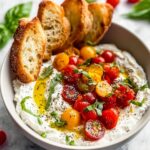 A fresh and flavorful Whipped Feta Bruschetta Dip that combines creamy whipped feta with a vibrant tomato basil bruschetta topping, served with golden, garlic-rubbed baguette slices. Perfect for appetizers or light gatherings.